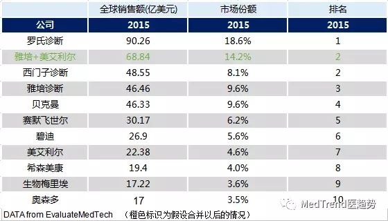 上周五 (4月14日),英国《金融时报》援引未具名知情人士的话报道称,雅培同意以每股51美元收购美艾利尔(Alere),总金额约为53亿美元,与2016年2月首次宣布的收购金额58亿美元相比降低了8.9%。 该交易预计将于2017年第三季度末完成,这场持续了一年多的收购大戏应该是要尘埃落定了。然而,全球IVD市场竞争格局动荡或许才刚刚开始。 2016年2月,当雅培首次宣布收购美艾利尔的时候,不仅是IVD界,整个医疗行业都因此引起了轩然大波。 因为这意味着作为诊断领域两大板块之一的IVD领域格局将发生剧变,罗氏诊断在IVD领域的“霸主地位”或将受到冲击,而通过收购美艾利尔,雅培很可能藉此打破2007年以来IVD市场的稳定格局。 据EvaluateMedTech数据,2015年罗氏诊断营收90.26亿美元,雅培诊断营收46.46亿美元,美艾利尔营收22.38亿美元。 按2015年的数据推断雅培和美艾利尔的总营收达到约69亿美元,这个体量虽然离第一的罗氏诊断还有一定的距离但是已经超出其他IVD公司很大一截了。因此,IVD领域很有可能将从此打破十年以来的4+X(罗氏、西门子、雅培、贝克曼)格局,变成2+2+X格局。 所以,雅培很有可能是一直在认真考量收购美艾利尔的交易。 正如雅培第一次提出终止此次收购时,Canaccord Genuity的分析师就曾说过:“雅培这样的安排有可能是为它未来的降价做一个铺垫。雅培最好的策略就是创造不确定性,让美艾利尔的股票下跌,然后美艾利尔的股东们便会愿意接受一个更低的价格。” 因此,雅培或将凭借收购美艾利尔,一举夺回IVD行业NO.2的位置,让稳定了十年的全球IVD格局产生巨大的变数。 雅培诊断在继续保持传统诊断优势的同时,并没有选择从当下大热的基因领域切入发展新市场,而是选择了切入同样是发展大热门但相对竞争较小的POCT领域。 一方面是因为雅培在POCT领域已占有一席之地,而在分子诊断和基因测序领域,罗氏、Illumina等公司早已遥遥领先。另一方面,美艾利尔占据了整个POCT市场20%的份额,在POCT领域独占鳌头。 投行Canaccord Genuity认为,合并后的新雅培将占据POCT市场份额的54%,一旦合并完成雅培在POCT领域的地位将一骑绝尘。