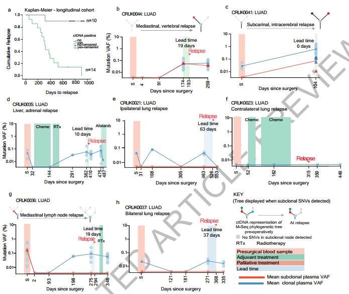 循环肿瘤DNA的系统发生学追踪。Abbosh et al. 英国弗朗西斯·克里克研究所的Charles Swanton及同事在TRACERx肺癌临床试验研究中,前瞻性地监测了100位转移性非小细胞肺癌患者从确诊到复发和死亡的演变过程,他们使用定制的测序面板分析了在术前和术后进行的多次液体活检。他们发现检测ctDNA可以预测治疗结果,如对术后化疗的抗性,在某些情况下还可以比传统临床方法更早地发现复发情况。因此,分析液体活检可能有助于增强识别有可能从术后化疗中受益的患者,并能跟踪复发期间不同癌症克隆和亚克隆的演变。