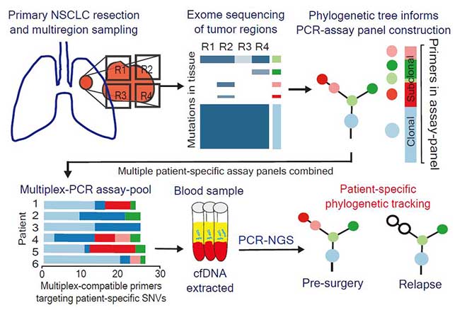 英国科学家发现肺肿瘤中不稳定的染色体会增加手术后癌症复发的风险,并且在标准测试之前就已经使用这种新的知识来检测复发。这是英国TRACERx肺癌研究计划的第一个成果,4月26日分别发表在新英格兰医学杂志和Nature。 TRACERx研究计划 TRACERx是第一个在实时性的和巨大的细节上研究癌症进化的研究。研究人员从诊断到疾病复发或治愈后手术随访病人,跟踪和分析他们的癌症是如何发展的。 该研究的领导者伦敦Francis Crick研究所的Charles Swanton教授说:“TRACERx研究计划是英国癌症研究协会在肺癌的最大单笔投资,将为我们揭示肿瘤是怎样进化和逃避治疗的。我们相信在TRACERx研究中产生的宝贵数据将被世界各地的研究小组所利用,帮助我们回答更多的关于肺癌生物学的问题,之前我们研究肿瘤进化只涉及了浅表。” NEJM上的报道