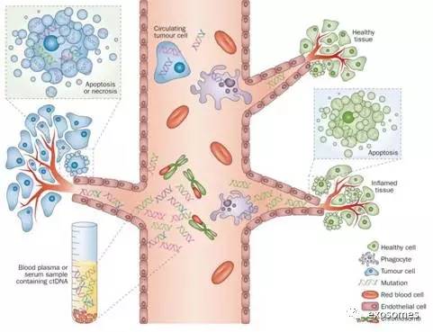 ctDNA——蛛丝马迹 Crowley, E. et al. Nat. Rev. Clin. Oncol. 2013 ctDNA(Circulating tumour DNA,循环肿瘤DNA)。ctDNA是cfDNA(cell-free DNA)的一种,一般来源于凋亡裂解的细胞。肿瘤细胞破裂释放到血液中的游离DNA,就是ctDNA。 多个研究表明,ctDNA的浓度与肿瘤的进展高度相关,因此我们可通过ctDNA来进行肿瘤的分期、预后评估,以及动态的耐药监测。它所携带的肿瘤基因组信息可用于用药指导,不仅取样简单,还能克服肿瘤组织在时间和空间上的异质性,展示更全面的信息。 CTC——邪恶排头兵 CTC 随着实体肿瘤的生长,在周围微环境发生了特定的变化时,一部分肿瘤细胞将获得异常的活动能力(上皮间质转化,EMT)。这些细胞如同邪恶的尖兵,从原发肿瘤上脱落,在身体里寻找新的落脚点。搭乘血液快线的脱落肿瘤细胞被称为循环肿瘤细胞(CTC, Circulating Tumor Cells)。 目前,CTC的计数可用于判断预后以及复发检测;对CTC进行单细胞测序,可指导肿瘤用药、掌握癌症的动态变化,及时调整治疗方案;从血液中分离出来的活体CTC,还可进行进一步培养,用于构建肿瘤研究模型等。 Exosome——特战小分队 Exosome 除了CTC和ctDNA,exosome(外泌体)是液体活检的新贵。外泌体是细胞分泌出的囊泡,包含的内容有蛋白质、DNA、信使RNA以及非编码RNA,是细胞间沟通的载体。研究发现,肿瘤细胞释放的外泌体的量较大,这些外泌体与肿瘤的发生、发展、转移以及抗药性有关。肿瘤细胞以外泌体为载体,迷惑免疫系统,从而逃过免疫系统的监视。外泌体不仅是通讯兵,也是工兵连,给肿瘤细胞的转移指引方向的同时,也创造适合肿瘤生长的微环境。 外泌体携带的信息多样化,其中的蛋白质和核酸,均可用于癌症的早诊、复发监测、抗药性监测等相关方面的分析。且外泌体在数量上多于CTC,更易富集;在形式上,分泌小泡能够有效保护核酸类物质,克服了ctDNA在血液中容易降解的问题,在临床应用上大有可为。