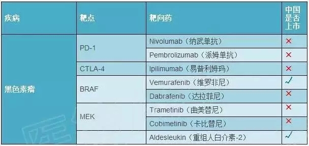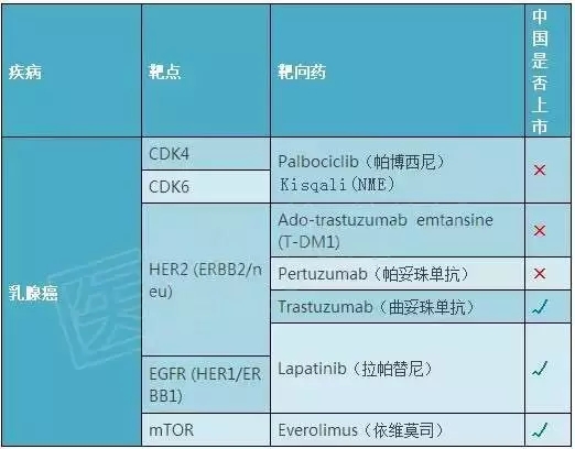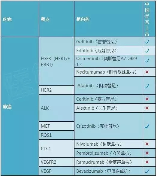 来源:医蟹;参考资料:美国FDA新药和仿制药注册与《新康界》史上最全癌症靶向药(2016版) 自我国药品审评审批制度调整以后,曾在国外获得批准的新药进入国内市场明显加速。由2016年起,截止到2017年第一季度,根据疾病种类和药物靶点,我们将靶向药物及其在中国的上市情况进行了汇总。 未在中国上市的药物尚无正式中文名称,文中提供的中文名为音译,仅供参考。 肺癌靶向药 乳腺癌靶向药 结直肠癌靶向药 白血病靶向药 淋巴瘤靶向药 甲状腺癌靶向药 黑色素瘤靶向药 肾癌靶向药 胃癌靶向药 胃肠道间质瘤靶向药 肝癌靶向药 食管胃结合部癌靶向药 多发性骨髓瘤靶向药 胰腺癌靶向药 妇科癌症靶向药 软组织肉瘤靶向药 其他癌症靶向药 |