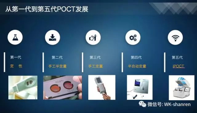 3、从第一代到第五代POCT发展历程 过去20年,经历了从第一代定性试剂、 第二代手工半定量、第三代手工定量+ 仪器、第四代半自动仪器+ 定量试剂 、第五代智慧医疗iPOCT的发展历程。