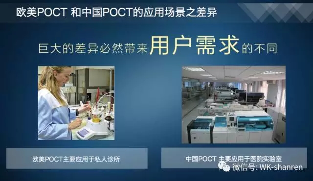 2、欧美POCT与中国POCT的应用场景之差异,巨大的差异必然带来用户需求的不同,欧美POCT主要应用于私人诊所,中国POCT主要应用于医院实验室。因此,欧美POCT应用主要是针对少量的病人和标本,而中国POCT应用主要面对大流量的病人和标本。