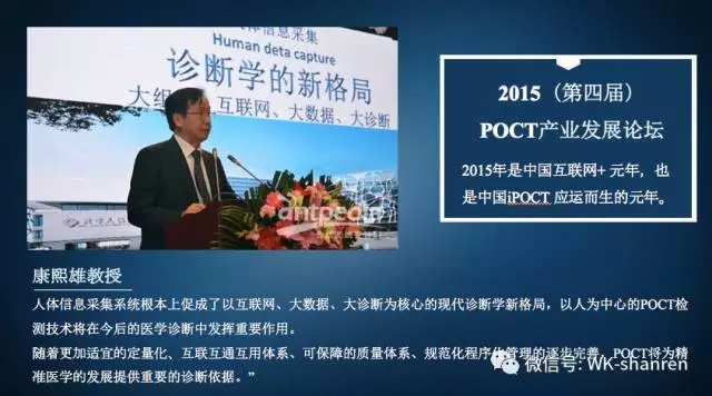 2015(第四届)POCT产业发展(太仓)论坛,康熙雄教授说:“人体信息采集系统根本上促成了以互联网、大数据、大诊断为核心的现代诊断学新格局,以人为中心的POCT检测技术将在今后的医学诊断中发挥重要作用。随着更加适宜的定量化、互联互通互用体系、可保障的质量体系、规范化程序化管理的逐步完善,POCT将为精准医学的发展提供重要的诊断依据。”康教授还特地指出:“2015年是中国互联网+ 元年,也是中国iPOCT 应运而生的元年”。