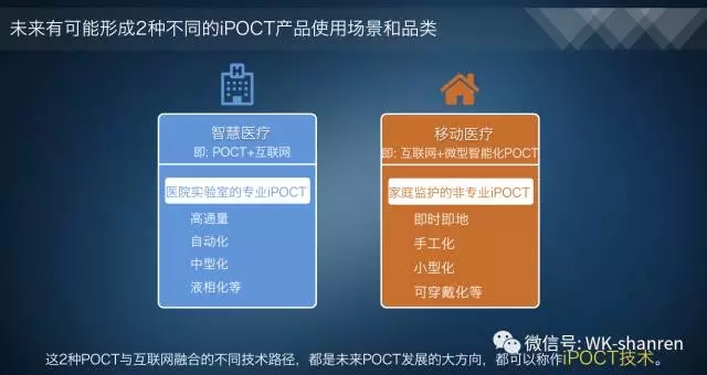 未来有可能形成2种不同的iPOCT产品使用新场景和新品类。一是智慧医疗,即POCT+互联网——医院实验室的专业iPOCT,高通量、自动化、中型化、液相化等;二是移动医疗,即互联网+微型智能化POCT——家庭监护的非专业iPOCT,即时即地、手工化、小型化、可穿戴化等。这2种POCT与互联网融合的不同技术路径,都是未来POCT发展的大方向,都可以称作iPOCT的技术应用。 因此,今天是我们跳出30年前欧美人的旧POCT定义的时候啦!属于未来的新POCT定义必定是互联网化的,同时将融合更多应用新技术和新场景,裂变成一个新品类 ——我们在此姑且将之命名为iPOCT,就让历史来检验吧!
