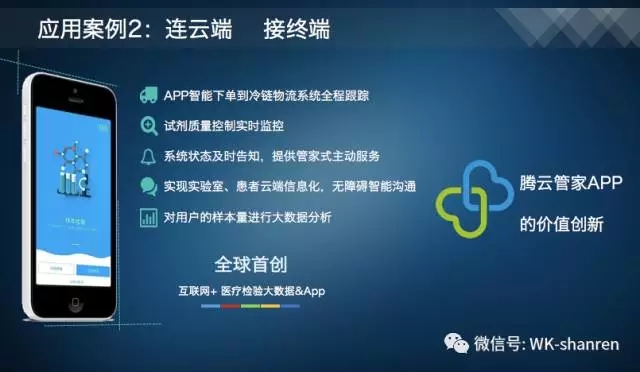 奥特满具有以下特点:(1)首次引入POCT 液相试剂技术理念,结合硬件液路技术,实现连续加样和连续检测,零手工操作;(2)仪器取样前自动混匀,无血沉影响;(3)实现全样本:血清、血浆、静脉全血、末梢血、尿液全兼容;(4)即来即测+批量检测(180Tests/Hour);(5)内置唯一码扫描功能;(6)10寸彩色触摸屏;(7)双向LIS和连接云端大数据及APP ;(8)检测项目: hsCRP+CRP、SAA、PCT、HbA1c、CysC、RBP、URBP、ASO、RF。 今后3年将陆续推出20+ 以上的项目族群。 2、连云端、接终端 腾云管家APP的价值创新:APP4.0 版本将实现智能下单到冷链物流系统全程跟踪、试剂质量控制实时监控、系统状态及时告知,提供管家式主动服务、实现实验室、患者云端信息化,无障碍智能沟通、对用户的样本量进行大数据分析,是全球首创、互联网+医疗检验大数据APP的颠覆式创新。
