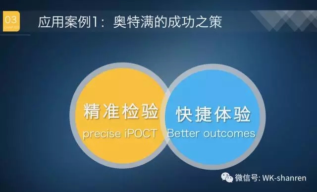 因此,不必再争“姓资姓社”,国外的POCT不等同于中国的POCT,拿出让中国用户尖叫的好产品才是王道! 三、2个iPOCT的成功应用案例 1、奥特满的成功之策是以:“精准检验(precise iPOCT)、快捷体验(Better outcomes)”的特点,运用互联网思维,专注用户体验,赢得了用户的青睐。