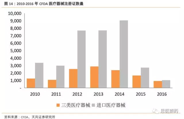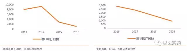 注册证难度加大,在三类产品体现更明显,2016年整体拿证数量骤减,其中进口品牌下降更多。
