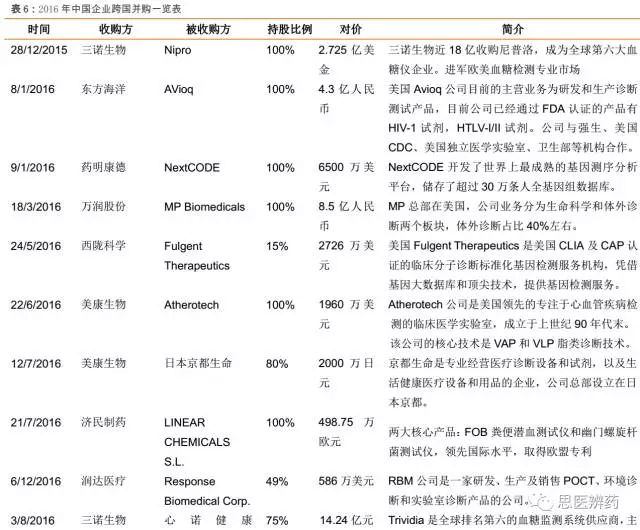 长久以来,国产品牌的主要战场在二级及以下医院,公立三级医院主要还是进口品牌,终端对价格的不敏感,使得部分已经达到临床要求,甚至性能超出进口品牌的优秀国产品牌始终无法抛去“国产的帽子”,没有在市场上公平竞争的机会。而随着国产设备的研发实力不断提升,尤其在登录资本市场后融资能力有了质的飞跃,未来进口替代只是时间的问题。同时,国家的政策保护,将有利于国产品牌的发展壮大,进一步奠定龙头企业的地位。 医保支付能力是医改的核心矛盾,国产器械有效市场空间不断扩容 降价/招标/医保控费,进一步降低医疗器械价格,国产市场扩容。将是未来医改针对的核心矛盾,医疗器械依然处于长期降价趋势。体外诊断按照项目收费,收费端是固定的,因此诊断仪器和耗材成为了成本项。不同省份的收费标准和收费规则有巨大的差异,相同项目的收费在不同省份,最大有5-10倍的差异。诊断产品的毛利极高,与不合理定价有密切关系。未来随着行业的规范化,收费标准下调是必然趋势。 各个省份的采购模式和招标政策都有明显的差异,大致分为如下几种模式: 1.直接挂网阳光采购:如陕西、四川等区域的阳光采购。 2.挂网+联合议价模式:比如西部六省联盟(陕西省、内蒙古自治区、四川省、宁夏回族自治区、青海省、甘肃省)、三明联盟(宁波、珠海、乌海、鄂尔多斯、玉溪、铜仁、太原、三明、厦门、唐山、邯郸、沧州、衡水、邢台、张家口以及河北28个医改示范创建县、庆阳等共41个地级市)、京津冀联盟、华东四省联盟等联盟团体。其耗材采购,集中建立在数据互联互通、资源共享的基础之上,再进一步推动跨区域的价格联动和联合采购,以进一步降低医用耗材虚高价格。 3.药交所模式:通过第三方药品电子交易平台(既独立于医疗机构和医药生产经营企业又独立于政府)集中交易工作。价格进行每季度滚动竞价。 4.三步评审双信封模式:如宁波、浙江、河南、新疆等省。以技术标+商务标的模式进行三步评审。 以上常见模式,其本质是以不同的形式来进行议价。在此之前,浙江地区的招标已经有多年历史,长久都是价格洼地,然而由于浙江的经济发展水平比较高,即使是县级医院也在使用生化免疫流水线,是非常优质的客户群体,因此进口品牌对于个别特殊的区域会给与特殊的价格政策。如果未来降价成为主流,各个省区都有降价的趋势,我们认为进口品牌大幅降价的可能性不高。 价格的下降和收费的下降,对于国产品牌而言都是利好,价格的下降会伴随着量的提升,目前体外诊断行业的进口占比在60-70%之间,收费标准下调,在产品可替代的范围内,国产品牌受益。 产业并购加剧,市场垄断巨头逐渐浮出水面 作为医疗器械中的重要组成部分,体外诊断由于其独有的属性,使得越来越多的企业能够在A股登录,借助资本的力量以更快的速度发展壮大。在上市前,不同企业的竞争优势体现在产品、渠道、推广等等方面。上市后,除了企业自身的发展,企业的并购整合、战略方向的不同使得企业出现了分化,同时融资难度降低,并购则是上市后企业得以发展最主要的工具之一。根据并购的主体和标的不同可以大致分为三类:海外巨头的并购和合并、国内企业海外并购、国内企业国内并购。 海外巨头合并,行业哥斯拉还在成长 纵观海外IVD巨头,经过一轮自由竞争,市场格局趋于稳定。在其细分领域发展到极致后,只靠内生增长发展速度有限,通过产业并购来注入竞争优势已经是习以为常的状态。企业的并购主要分为技术产品的并购和市场份额的并购。技术产品的并购,缩短了企业的研发周期和降低了研发风险,同时结合初创企业的创新优势和成熟企业的产业化能力而快速推出新产品抢占市场。而市场份额的并购主要是以竞争对手为主,通过提升市场份额,拉大和其他竞争对手的距离,使得市场有序化,避免了市场激烈的价格竞争。企业之间的并购由小企业为主要标的的方式转变为跨国巨头之间的合并。2016年大型的上市企业并购持续成为产业的热点,马太效应的加剧,强者恒强的态势在持续发展。