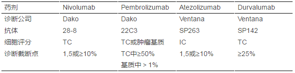 PD-L1表达和肿瘤微环境 预测肿瘤对PD-1阻断剂的反应依然是个挑战。明显的,预先存在的抗肿瘤免疫中抗原特异性CD8+T细胞受PD-1/PD-L1负调控,所以PD1阻断剂对此有疗效。用免疫组织化学法评估PD-L1表达是一种预测肿瘤对PD-1阻断剂反应貌似不错的生物标记法。然而,无论对肿瘤细胞上还是浸润免疫细胞上的PD-L1的表达进行评估,在用免疫组织化学法进行测量是一种存在高度变异性、异质性和动态标记法,这固有属性导至其在预测PD-1/PD-L1阻断剂效应时的局限。 另外,PD-L1表达细胞在肿瘤微环境的位置也重要。在一项黑色素瘤的研究中,利用pembrolizumab进行治疗,连续采集肿瘤样本发现在有反应患者中肿瘤内CD8+T细胞出现扩增。这些患者中的预治样本显示表达PD-1和PD-L1的CD8+T细胞在浸润边缘,该情况也在随后的基于CD8表达预测模型的另一个独立15名病患的队列中得到验证。虽然如此,3种免疫组织化学法检测PD-L1表达的方法最近被FDA批准用于指导治疗尿路上皮癌、黑色素瘤和非细小细胞肺癌方案的确定,每个用不同的方法,不同的阈值筛选PD-L1过量表达。其他的如Ventana SP263方法也正在开发,这个是随durvalumab(Astra Zeneca/Medimmune)一起被研制的(表 2)。除了技术的挑战和PD-L1表达检测方法的不同外,每种方法看似显示出表达与反应的关系。在许多肿瘤细胞中,真正PD-L1阳性的肿瘤细胞数量比例可能很低;在BMS试验被定义为DAKO阳性中就5%或多些。PD-L1免疫组织化学法比较蓝图项目(The Blueprint PD-L1 IHC Assay Comparison Project)是四家药企(AstraZeneca PLC阿斯利康,Gaithersburg盖瑟斯堡,MD马里兰州;Bristol-Myers Squibb Company百时美施贵宝公司;Genentech,Inc.基因泰克和Merck & Co. Inc.默克)和两家诊断公司(Agilent Technologies Inc.安捷伦/Dako Corp达科, Carpinteria卡平特利亚, CA加利福利亚和Roche罗氏/Ventana Medical Systems, Inc本塔纳医疗系统, Mountain View芒廷维尤, CA加利福利亚)开展的主要合作,比较和发现每个他们的PD-1/PD-L1 IHC方法的特征以期进行调和。该项目I期情况在2016年AACR年会上进行了展示,关注在一个非小细胞肺癌病患小队列中调和PD-L1表达检测方法的可行性,并显示已经临床验证且检测方法间具有可调和性。II期将需要较大努力就最近的发现进行验证。虽然如此,PD-L1表达与对PD-1/L1靶向治疗反应的关联性还是较高的,PD-L1阴性不能排除反应,所以在临床上应用受限因为现今无法排除治疗无反应的病患。 表 2 PD-L1免疫组织化学分析法