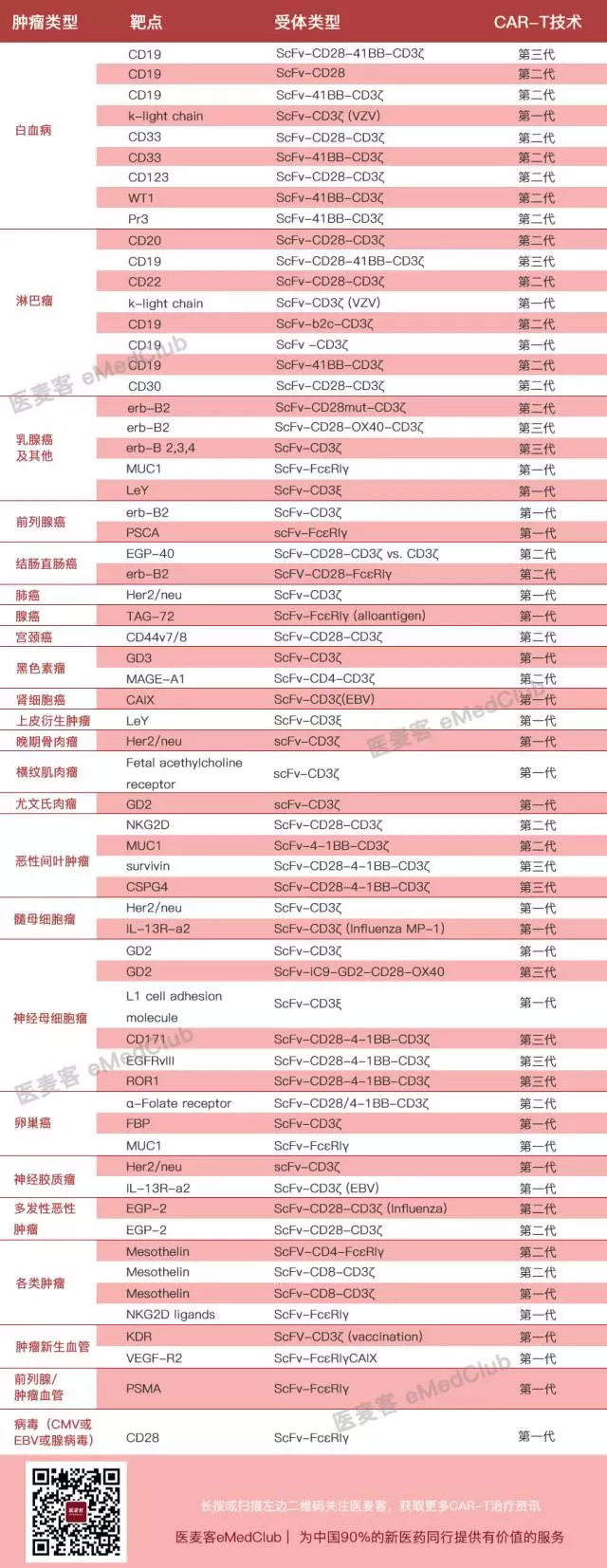 目前全球正在进行且可查询的临床试验有很多(包括第一代至第三代CAR),除了CD19 之外,还有哪些靶点被用于肿瘤的CAR-T治疗呢?今天医麦客小编阿紫姑娘把CAR-T临床所使用的靶点、对应的肿瘤类型、受体类型以及所使用的第几代CAR技术做一个全面的汇总,希望对麦粉们有参考意义。