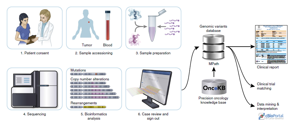MSK-IMPACT的工作流程 首先来看看什么是MSK-IMPACT。这项技术是科学家们在纪念斯隆-凯特林癌症中心开发,是一种基于NGS panel的杂交捕获技术,可检测与癌症相关的341个基因中的所有蛋白质编码突变、拷贝数变异、启动子突变以及结构重排。不过根据最新的发现,目前这种方法已经能够检测与癌症相关的410个基因。 从MSK-IMPACT的工作流程图我们可以看到,患者首先要签订肿瘤与正常序列配对分析的知情同意书,然后研究人员收集患者的血液样本作为正常DNA的来源,利用自动化的方法来提取肿瘤和血液样本的DNA,并使用靶向410个基因的所有编码外显子的杂交探针来制备文库,随后是测序、数据分析。所生成的数据结果加载到自家开发的基因变异数据库中,并手动检测数据的质量和精度。基因组变化会在电子病历报告中显示,并被发送到机构开发的数据库中,这有利于自动化临床试验匹配,变异数据还会自动上传到cBioPortal中进行挖掘以及解读。 300多种肿瘤生成了无与伦比的数据集 自从该方法在CLIA实验室中开发以来,研究人员们已经使用它对上万名各类实体肿瘤患者进行测序。他们最关键的研究思路就是:利用正常组织与肿瘤组织相匹配,以汇编各个肿瘤的体细胞突变目录。从这个方向努力,研究人员终于生成了一个无与伦比的数据集。这个数据集包含了晚期癌症患者的癌变组织和正常组织的DNA序列、相关病理与临床注释数据。成熟的临床治疗反应和疾病相关的注释结果,使得这个数据集对确定新的生物标志物以及预测后续治疗反应有重要的意义。