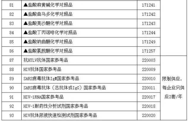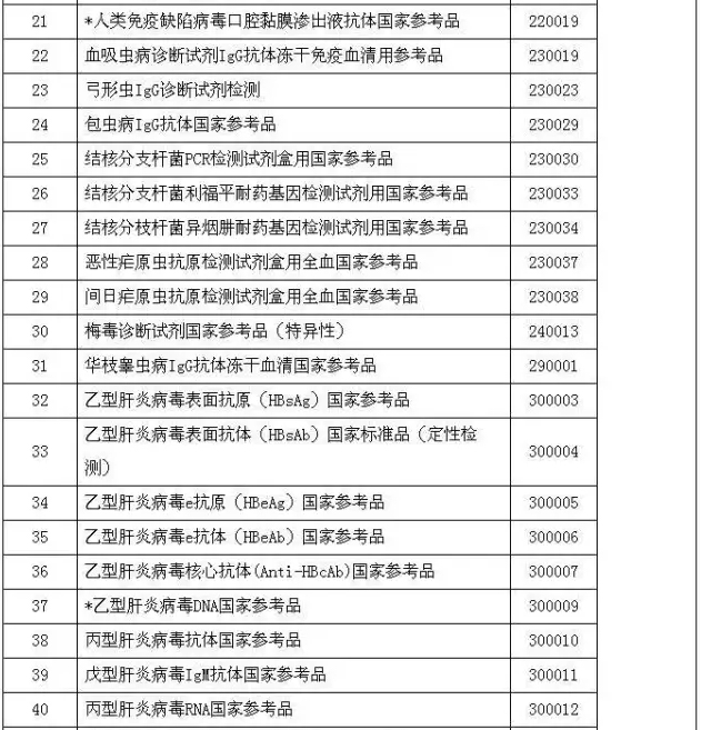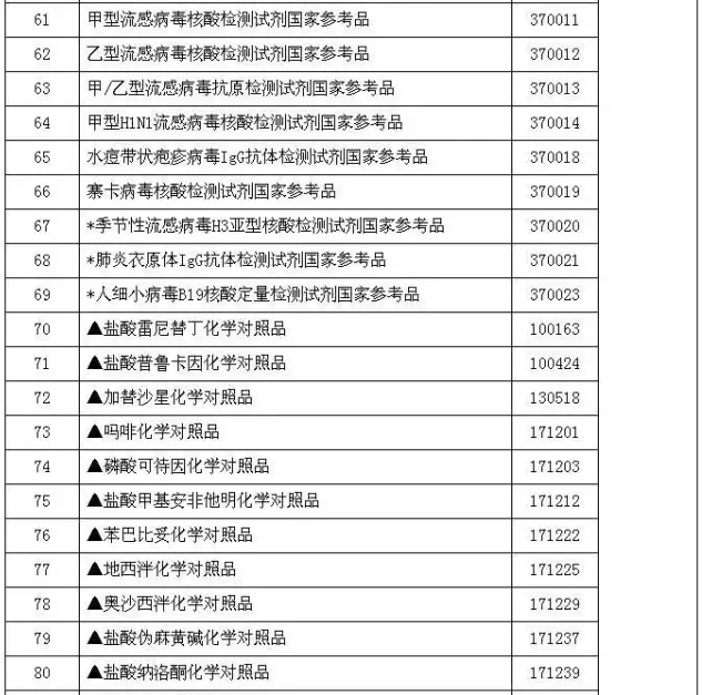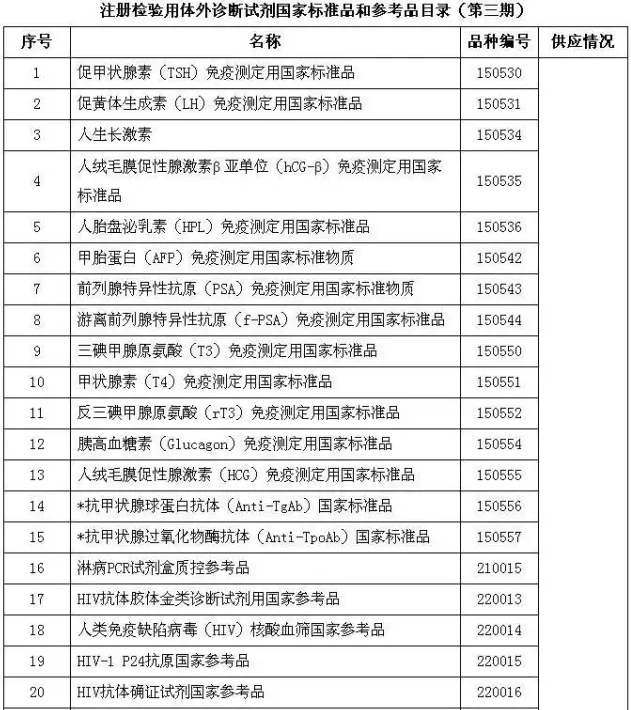 为配合《体外诊断试剂注册管理办法》(国家食品药品监督管理总局令第5号)的实施执行,经各方共同努力,在注册检验用体外诊断试剂国家标准品和参考品目录(第二期)的基础上,新增15个品种,同时将17个可用于体外诊断试剂检验的化学对照品纳入目录,现将93个品种公布如下。