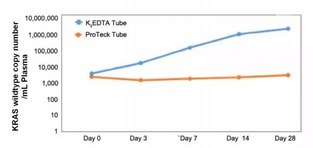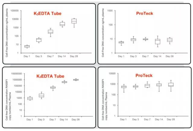 近年来,随着测序技术的高速发展以及国家一系列利好政策的推动,以血浆中的游离DNA(cell free DNA,cfDNA)为研究对象的无创产前诊断和肿瘤液体活检产业蓬勃发展。由于血浆内胎儿DNA和循环肿瘤DNA(circulating tumor DNA,ctDNA)含量较低,低频突变或超低频突变的检测仍困难重重。 在母亲血浆中,单胎妊娠早期的胎儿释放的游离cfDNA浓度小于10%(1)。随着保存时间的延长,白细胞降解及随之而来的母体基因组DNA(gDNA)的释放将严重影响低含量的胎儿DNA的比例及完整性。对于循环肿瘤DNA而言,这一问题更为突出。在癌症早期,突变等位基因的频率(mutant allele frequencies,MAFs)可能低至1/10,000(2)。cfDNA样本本身在保存过程中如果被“背景”gDNA干扰,会造成检测灵敏度的大幅度降低以及大量数据的浪费。因此如何稳定血浆中的白细胞,降低其在保存过程中因降解而释放大量gDNA造成的“污染”,是液体活检的重要一环。 图1. 怀孕母亲和肿瘤病人的cfDNA分别包含来自胎儿和肿瘤的有效信息。通过采集,分离,提取和分析血浆中的cfDNA有助于实现对胎儿和肿瘤的检测与诊断 对于cfDNA的保存,利用超高速离心分离血浆是最直接有效的避免白细胞gDNA干扰的方法。但是实际样品采集中,往往不具备高速离心和冷冻保存的条件。游离核酸采血管便在这种情况下应运而生。这些保存管的目的就是尽可能长时间的在常温状态下保存血浆中的游离核酸。目前商业化的游离核酸采血管,有些利用甲醛等交联剂稳定白细胞减缓背景gDNA的释放。但是这些交联剂会损伤cfDNA,并且会降低测序检出率。 最近,我们了解到一个名为ProTeck® (CFGenome, LLC, Denver, CO)的游离核酸采血管,ProTeck®游离核酸采血管是来自美国CFGenome®公司的最新研发产品。针对游离核酸保存痛点,ProTeck®采血管利用蛋白酶抑制剂和代谢酶抑制剂稳定白细胞,减少其裂解引起的gDNA对cfDNA的污染。 ProTeck®游离核酸采血管容量为10 mL,内含300 μL特有的cfDNA稳定剂,用于抑制血细胞的代谢。与市场的同类产品相比,保存时间长达28天。血浆样品收集到ProTeck®采血管中,即刻便可抑制血细胞的代谢活动,减少gDNA释放。如图2可见,28天内ProTeck®采血管里的cfDNA的整体含量稳定;而在K3EDTA采血管(BD vacutainer®,Becton Dickinson,Franklin Lakes, NJ)中,cfDNA的总量则随着时间推移则有显著增加,原因在于白细胞裂解,释放了大量背景噪音的gDNA片段。 图2.血浆cfDNA总量在28天保存期内的变化。ProTeck®采血管有效抑制了背景gDNA释放对cfDNA总含量的影响。来源:CFGenome®Time Stability测试数据 基于对背景DNA的有效抑制,ProTeck®采血管对于ctDNA的突变检出表现优秀。图3显示,KRAS野生型基因在K3EDTA采血管中随着时间推移背景干扰逐渐增加,导至低频突变被噪音gDNA淹没。 图3. 血浆cfDNA中KRAS野生型基因的在K3EDTA 采血管和ProTeck tube 28天保存期内的拷贝数对比 如表1显示,仅一天后,K3EDTA采血管中的KRAS基因突变(Exon2,G13D)无法被有效检出。相比之下,保存在ProTeck®采血管中的血浆样本即使28天后仍然可以检出该低频突变。 表1.KRAS基因Exon2的G13D突变在K3EDTA和ProTeck®采血管28天保存期内的检出结果对比(therasreen KRAS RGQ PCR kit) 由此可见,ProTeck®采血管是集“采样、保存、运输”为一体的新一代游离核酸采血管。其特有的超长期保存和有效抑制背景gDNA污染将进一步解决现有cfDNA样本保存的难点问题,方便了样本储存和运输,简化了临床实验室的运作。其专利独有的新型保存剂能够高效固定血液细胞,避免基因组DNA释放造成对ctDNA的污染,确保低频突变的有效检出。像ProTeck®这类的采血管将有助于从事无创产前诊断和液体活检服务的供应商扩展有效服务半径,同时实现从源头上把控样品质量。 参考文献: 1. Lo YM, Tein MS, Lau TK, Haines CJ, Leung TN, Poon PM, et al. Quantitative analysis of fetal DNA in maternal plasma and serum: implications for non-invasive prenatal diagnosis. Am J Hum Genet 1998;62:768–75. 2. Thierry AR, Mouliere F, El Messaoudi S, Mollevi C, Lopez-Crapez E, Rolet F, et al. Clinical validation of the detection of KRAS and BRAF mutations from circulating tumor DNA. Nat Med. 2014; 20: 430–5. |