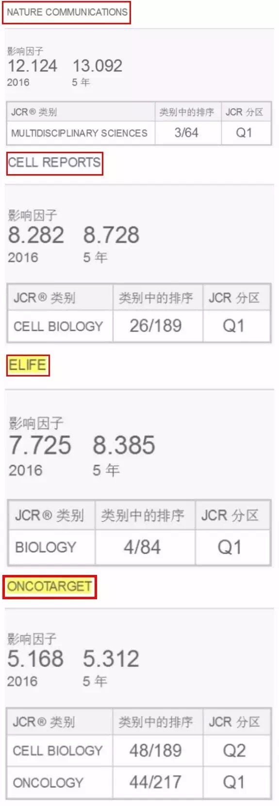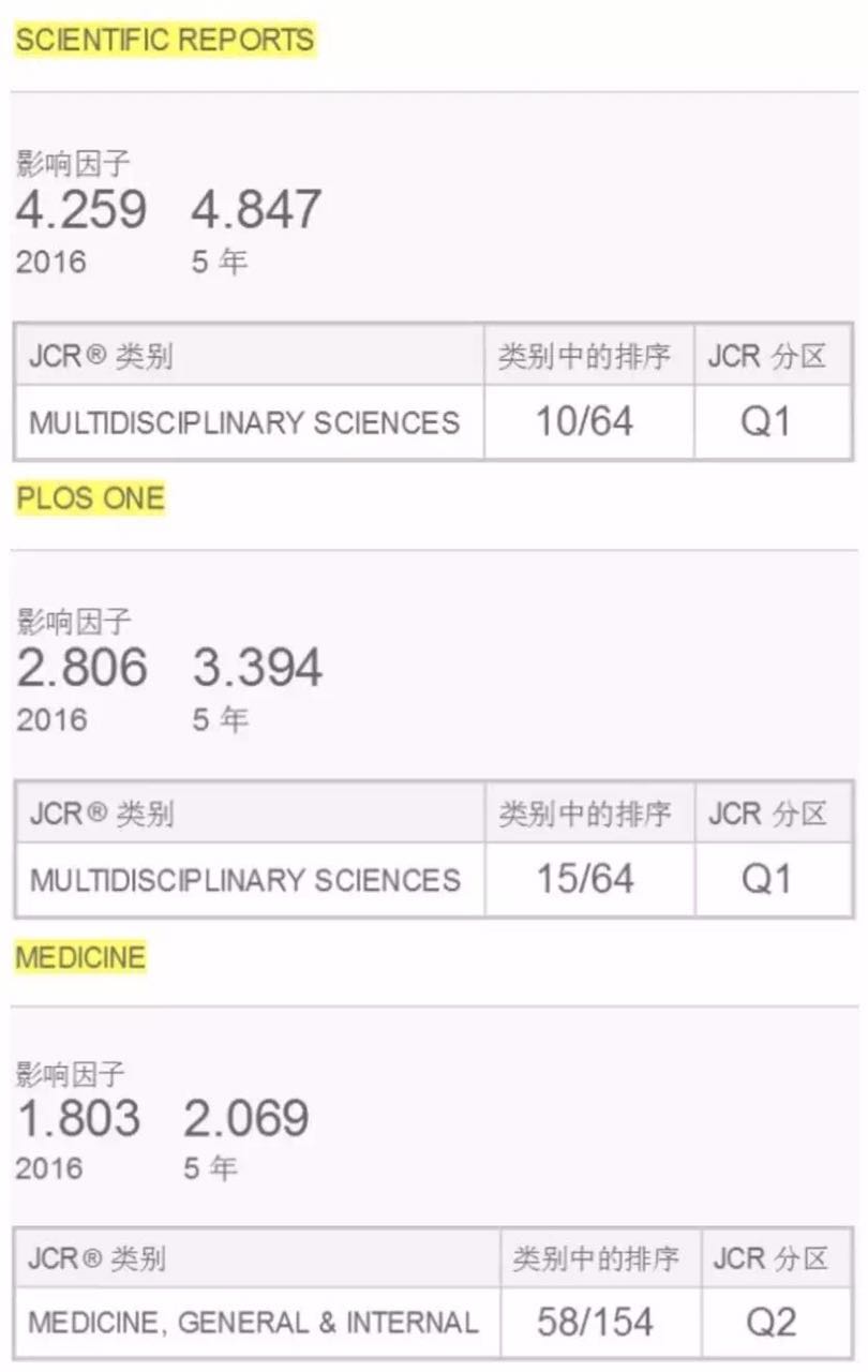 5. 几大OA期刊 以上这些都是高高在上的,我们现在更关注那些接地气的OA期刊。与往年相比,NATURE COMMUNICATIONS 、CELL REPORTS、ONCOTARGET的IF均有所上升! 而ELIFE、SCIENTIFIC REPORTS、PLOS ONE、MEDICINE均不同程度下跌,PLOS ONE跌破3分线,MEDICINE更是惨不忍睹的到1.803。
