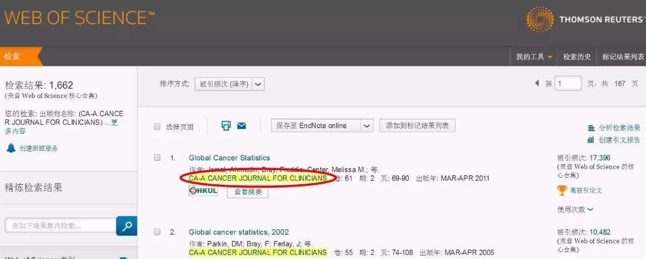 ② 在检索得到的结果中,随意单击其中一篇文章题目下面的杂志名,即可弹出一个现实期刊最新影响因子和JCR分区的小框;