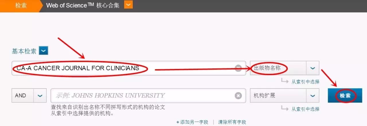 6. 最新IF查询方法 最后如果你等不及的话,如何即刻查询期刊的最新影响因子呢?方法如下: ① 打开Web of science,输入期刊名称,选择“出版物名称”进行限定;