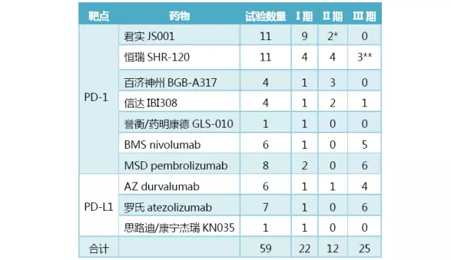 表1 各公司PD-1/PD-L1单抗的国内临床推进速度 注:KN035为单域抗体,为方便比较分析,本文也归为单抗。批准临床时间数据来源于医药魔方数据库,临床试验数据来源于国家药物临床试验登记与信息公示平台 从表1可以发现一个有趣的现象,国内企业正好两两一起在相近的时间拿到临床批件:君实和恒瑞分别在2016年1月和2月;信达和百济神州都在2016年9月,并只相差1天;嘉和生物和思路迪/康宁杰瑞分别在2016年12月和2017年1月。 从拿到临床批件到首次伦理审查时间(不是获得伦理批件时间)来看,最神奇的是罗氏,竟然在拿到临床批件前251天就获得首次伦理审查的机会,思路迪/康宁杰瑞提前了1天,这说明目前国内的伦理委员会并不一定非要有临床批件才能进行伦理审核。信达是在拿到临床批件后5天开始伦理审查,其他大部分企业也在1-2个月内进行了首次伦理审核。这也意味着方案,甚至整个临床研发策略早就完成,而不像以前等拿到临床批件再开始撰写方案,做完I期再想II期怎么做。当然PD-1/PD-L1单抗在国外的研究都很透彻,哪些瘤种敏感也早就了解,有利于临床研发策略的制定。 方案的定稿以及整个伦理资料的准备时间体现企业医学团队和运营团队的实力。而从获取临床批件到第一例受试者入组时间间隔更多的提示了各企业供应研究药品的能力,因为在这些试验中不存在招募受试者的困难,研究药品一到医院就可以启动、就可以入组病人。 02、临床试验数量 截止2017年6月20日,君实和恒瑞都开展了11项试验,但恒瑞已有3项进入了III期,适应症分别是既往经过治疗的晚期肝细胞癌(II期/III期)、一线治疗失败的食管癌以及联合培美曲塞和卡铂一线治疗EGFR/ALK基因野生型非鳞癌非小细胞肺癌;信达和百济神州都有4项试验正在开展,但信达已经有1项进入III期,适应症为一线含铂化疗失败的鳞状非小细胞肺癌;誉衡/药明康德和思路迪/康宁杰瑞都只有1项I期正在开展。