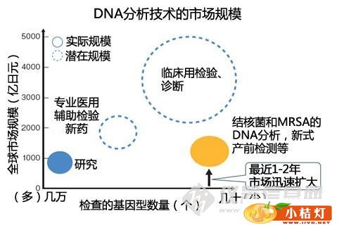 DNA分析的市场规模 过去市场长期增长停滞主要是由于两方面的原因: 一是涉足医疗领域的门槛高,在各国要进入医疗领域都要经过政府机构复杂的审批程序。疗效审批等必要手续对从其他领域跨入医疗领域的而企业来说困难是尤其的大。即使好不容易获得了产品销售许可,能否使用医疗保险等也是未知数,可谓困难重重。而对采用POCT的诊疗来说,能否使用保险直接决定着业务的成败。 另一方面,新的检测技术很多都在诊断结果的有效性和再现性方面存在较大的问题。有些企业曾经一度取得了美国食品药品监督管理局(FDA)的批准和日本《药事法》临床应用产品的销售许可,但后来因为出现了推翻临床应用有效性的数据,许可遭到取消。 新的转机:每种检测市场规模都有数亿美元 这样的状况直到最近才发生转机。突破批准许可和技术可靠性的障碍、实现DNA诊断和POCT蓝图的技术和产品在近年来不断出现。