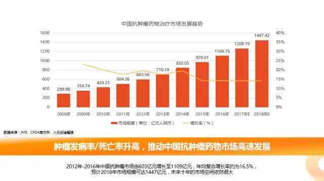 肿瘤发病率/死亡率的不断升高,推动抗肿瘤药物市场不断高速发展。据IMS数据显示,2014年全球用于治疗肿瘤的药物费用为1000亿美元,远高于其他疾病的用药开销,成为全球第一大药物市场。 我国抗肿瘤药物市场规模也呈逐年上升趋势,从2012年的603亿元增长至2016年的1109亿元,年均复合增长率约为16.5%,预计2018年市场规模可达到1447亿元,未来十年的市场空间依然很大。