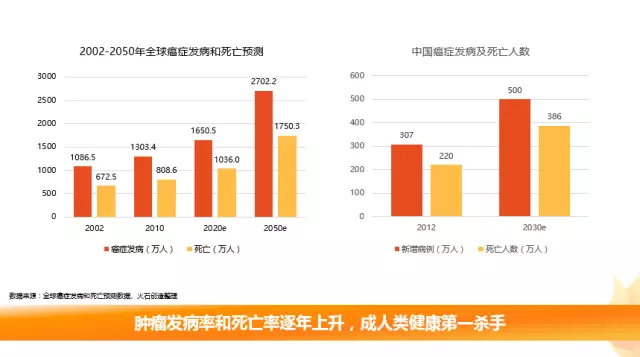 肿瘤免疫治疗行业概况 癌症发病率逐年上升,推进肿瘤治疗市场发展 随着全球人口不断的增长与老龄化的加剧,肿瘤的发病率和死亡率逐年上升,已经成为危害人类健康的第一杀手。根据全球癌症发病和死亡预测数据显示,2010年全球癌症发病人数达到1303万人,死亡人数约808万人,预计到2050年,全球癌症发病人数将达到2702万人,约有1750万人死于癌症。 我国的情况亦是如此。据不完全统计,2012年我国新增癌症病例约307万例,其中约220万人死于癌症,预计到2030年我国新增癌症病例将达到500万人,死亡人数将达到386万人。