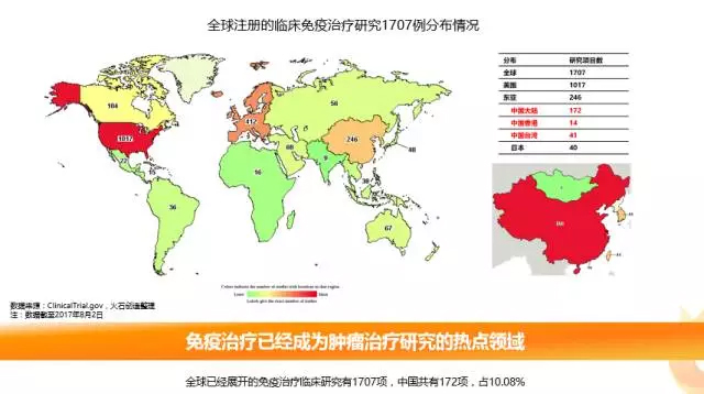 肿瘤免疫治疗市场规模有望突破千亿美元 随着重磅产品陆续获批上市,肿瘤免疫治疗已经成为全球生物医药界备受瞩目的新星。据ClinicalTrial的统计数据显示,截至2017年8月,全球共有1707例临床免疫治疗研究,其中美国1017例,中国大陆注册了172例,约占总数的10.08%。免疫治疗已经成为肿瘤治疗研究的热点领域。