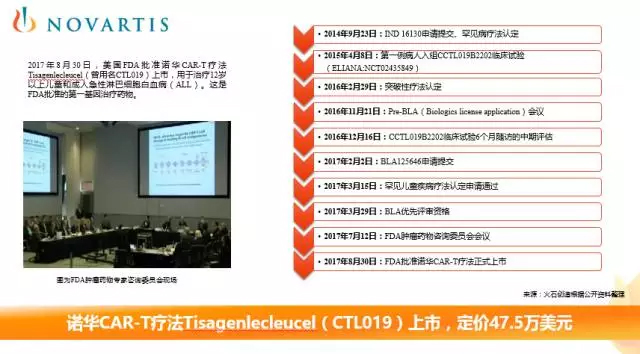 2017年8月30日,美国FDA批准诺华CAR-T疗法Tisagenlecleucel(曾用名CTL019)上市,用于复发或难治性儿童和年轻成人急性淋巴白血病(ALL),使之成为FDA批准的第一基因治疗药物。诺华为其定价47.5万美元。
