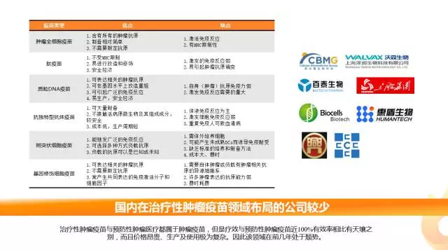 治疗性肿瘤疫苗 基于新抗原的个性化肿瘤疫苗将为研究迎来暖春 肿瘤疫苗并不是新概念,比如HBV疫苗、HPV疫苗等,但这都是预防性肿瘤疫苗。治疗性肿瘤疫苗的疗效与其近100%有效率相比有天壤之别,由于价格昂贵、生产及使用极为复杂,因此该领域在前几年处于颓势。国内布局该领域的企业也相对较少。