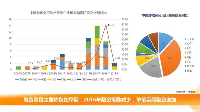 从融资阶段分析,国内肿瘤免疫治疗的投融资主要集中在早期阶段,2016年融资数量与上一年相比有一定的减少,但单笔融资金额却较2015年增加。