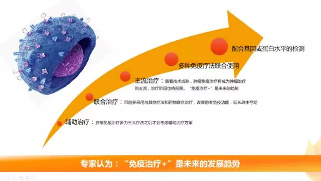 “免疫治疗+”将成为未来趋势 早前,肿瘤免疫治疗大多作为三大疗法之后才考虑的辅助治疗方案,用于维持肿瘤稳定,降低放化疗的副作用。随着研究和临床试验的深入,目前临床上大多将免疫疗法联合药物治疗,改善患者免疫功能,清楚肿瘤微小残留,延长总生存期。越来越多的临床试验结果证明,免疫治疗联合用药与传统药物相比对肿瘤存活率的提高约达一倍之余。