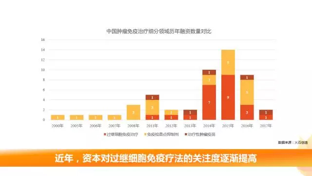 免疫检查点单抗是近年领域内投资热点,但从细分领域历年融资数量分析,资本对过继细胞免疫疗法的关注度逐渐提高。资本的助力将进一步推进细胞免疫治疗的临床研究进展。