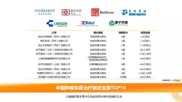 从领域内披露融资金额TOP10的企业分析,不难发现,国内巨额融资基本集中在布局免疫检查点抑制剂的企业。其中药明康德不仅涉及到免疫检查点单抗的研发,亦与细胞疗法巨头之一的JUNO公司合作布局CAR-T细胞疗法的研发。