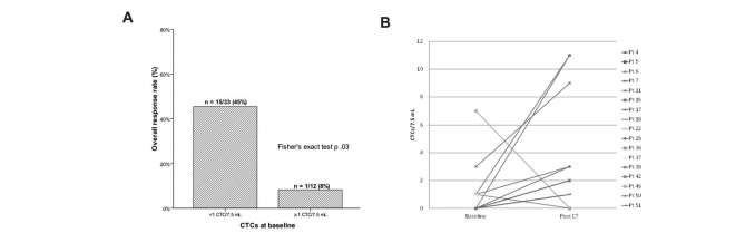 近期宁波第七人民医院副院长兼外三科主任郝敬铎医师近日在宁波市惠民计划的赞助下,运用美晶医疗的CellRichTM新型液体活检平台对转移性肿瘤(入组数十例结直肠癌,前列腺癌,乳腺癌及头颈部肿瘤)患者实施CTCs检测时发现,在早期肿瘤患者中,利用影像学还未发现病灶时已经可以在外周血中检测到CTCs。研究表明,在疾病的早期,外周血循环肿瘤细胞对于良、恶性肿瘤的鉴别有一定的提示价值,也有助于转移风险的预测和判断;在疾病进展和治疗过程中,外周血循环肿瘤细胞能为动态检测病情、耐药性等临床诊疗的关键因素提供重要信息,有助于医师开展个性化的肿瘤治疗。 3.循环肿瘤细胞在头颈部鳞状细胞癌中的应用 头颈部鳞状细胞癌(head and neck squamous cell carcinoma: SCCHN)是头颈部最常见的恶性肿瘤,约占头颈恶性肿瘤的90%,占全身恶性肿瘤的10%。WHO统计,全球每年新增病例约65万例,治疗方式从单一手术转变为手术,放化疗,分子靶向治疗等多学科联合模式,任然有50-60%的患者出现原位复发,区域淋巴结转移,约有20%的患者发现远处转移,其5年生存率在50%左右,且近几十年来没有显著提高。因此CTCs做为可评估HNSCC的早期检测及预后的检测指标,而备受关注【7,8】。 2010年美国俄亥俄州国立儿童医院头颈部肿瘤外科Jatana团队【9】对48例HNSCC术后患者的血液样本进行CTCs计数分析,随访19个月后发现没有检测出CTCs的患者无病生存率明显高于检测出CTCs的患者,两组之间差异有统计学意义(P=0.01)。CTCs与患者年龄、性别、肿瘤位置(口腔、口咽、喉咽、喉)、肿瘤分期、是否加辅助治疗均无相关性,认为CTCs可以做为HNSCC预后不良的独立危险因素。 其后意大利巴伦西亚大学肿瘤医学科的Grisanti研究组在2014年发现,当CTCs数量》2个时,HNSCC患者的预后比CTCs数量为0-1个的患者更差,患者的疾病无进展生存率与总生存率也更差。经过治疗后8%的CTCs阳性患者得到了控制(见图5:化疗前后CTCs数量变化与预后关联)。该实验结果刊登在2014年注明期刊Pos One【10】。