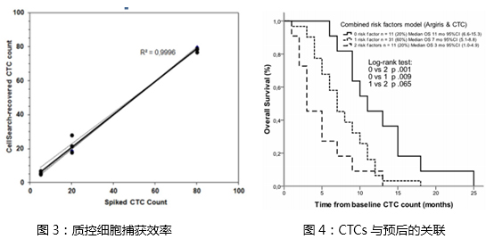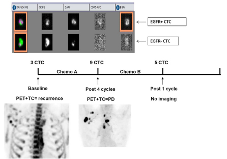图5:化疗前后CTCs数量变化与预后关联(引用自PLoS One.2014 Aug 8;9(8)) 入组的1位头颈部鳞状细胞癌患者,化疗前基线CTCs数量是3个CTCs,连续4个疗程的化疗后,CTCs数量上升到9个,同期实施的PET-CT所见显示,在左腋下与脊髓部阴影明显增加,预示肿瘤进展未得到控制。调整化疗方案仅一个疗程,CTCs数量从9个下降到5个,充分说明了CTCs即可以作为判断HNSCC预后的指标,又可以预测治疗效果。(图6)