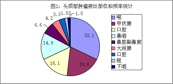 头颈部肿瘤包括颈部肿瘤、耳鼻喉科肿瘤以及口腔颌面部肿瘤三大部分。比较常见的是甲状腺肿瘤,喉癌、副鼻窦癌及各种口腔癌(如舌癌、牙龈癌、颊癌等:见图1)。因此,头颈部肿瘤的原发部位与病理类型居全身肿瘤之首。同时,头颈部重要器官比较集中,解剖关系复杂,治疗方法各异。据WHO评估,我国近年头颈部肿瘤的年发病率为每10万人中15.22人次(15.22/10万),占全身恶性肿瘤的4.45%。按部位(图2所示),头颈肿瘤的发病依次为喉(32.1%)、甲状腺(19.6%)、口腔(16.1%)、鼻咽(14.9%)、鼻腔副鼻窦(6.6%)、大涎腺(4.2%)、口腔(3.3%)、眼(1.52%)、下咽(1.5%)。在性别上,除甲状腺肿瘤女性(14.2%)明显多于男性(5.40%)外,其余以男性居多。其病因尚未查清,有人认为与遗传因素有关;长期接触有害的化学气体及吸烟,亦为诱发因素之一。