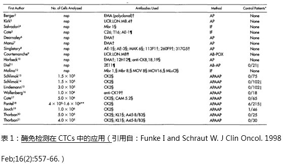 图2:头颈部肿瘤病灶部位和频率统计 循环肿瘤细胞(circulating tumor cells,CTCs)是指从原发性实体瘤或转移灶释放,突破血管从而进入外周循环血的肿瘤细胞。由于CTCs的稀有性,抗原异质性而难以富集/捕获,研究者早期主要致力于CTCs的富集与捕获。目前CTCs已成为多种类型癌症,如乳腺癌,肺癌,前列腺癌和结肠直肠癌对于良、恶性肿瘤的鉴别有一定的提示价值。美晶医疗与宁波市第二医院放化疗科,李惠利东部医院及宁波七院胃肠外科的临床合作中对不能手术或不愿手术的局部进展期胃癌患者进行同步放化疗,并观察疗效和不良反应,取得了较好的效果,发现CTCs在胃癌的预后评估及个体化治疗,疗效监控等方面具有重要的临床意义。但CTC在头颈部肿瘤中的研究相对较少。本文主要从CTCs的特性、检测手段及其在头颈部肿瘤中的应用进行概述。 1.循环肿瘤细胞的特性与检测手段 自1869年Ashworth首次报道外周血循环肿瘤细胞(circulating tumor cell ,CTCs)的发现以来,关于CTCs的出现是”肿瘤转移扩散“还是仅为原发病灶脱离的”单纯肿瘤细胞“的问题已经讨论了近半个世纪之久。在过去的10数年,伴随着分子病理学,免疫细胞组化等高敏技术的诞生,又重新燃起了CTCs临床意义的研究热潮。1996年Abati【3】等提出尽管外周血中仅有非常少的一部分CTC能存活下来并形成转移灶,但是CTC的存在就可能为转移额发生提供了基础,且近年的许多研究证实CTC的出现与患者的预后呈正向相关,美国德州大学MD Adeson病院的Christfani等数个研究团队证明,乳腺癌,结直肠癌患者CTC辅助临床诊断可以作为一个独立的预后指标。 肿瘤细胞从原发灶生长至发生转移与其他恶性肿瘤往往经历原发灶的原位生长(原位癌)、突破基底膜成为浸润癌、肿瘤细胞突破血管内皮细胞从而进入血液循环、随血液在全身播散的肿瘤细胞滞留于远处器官的毛细血管、在转移灶的定植和生长等恶性行为。在这一过程中,CTCs被认为与恶性肿瘤的复发、转移密切相关,因其对肿瘤的早期诊断、临床分期、复发转移和耐药监测、预后判断、开发新的治疗靶点具有重要价值。2012年德国海德堡大学普外科脏器与移植专业的Steiner团队在Langenbecks Arch Surg上发表的研究指出【4】,每克原发肿瘤灶或转移灶每天约有106个CTC脱落进入外周血循环,而90%的CTC因为人体的免疫调节系统和自身凋亡而失去活力,且CTC在外周血细胞中阳性率较低,与正常血细胞的比值约千万分之一到亿分之一之间。 目前CTCs检测技术主要分为物理学模式(如以细胞大小差异和过滤为基础的方法等),正向/负向筛选模式或借助微流控芯片(CTC-Chip)。作为中国自主研发的自动化循环肿瘤细胞检测系统,美晶医疗CellRichTM循环肿瘤细胞检测系统采用免疫纳米磁颗粒并结合先进的微流体芯片设计专利技术对微量细胞进行捕获和分析,是一种先进的循环肿瘤细胞检测与分析平台。该平台具备正负向细胞筛选模式:在正向筛选模式中,通过将循环肿瘤细胞上的特异抗原与纳米磁颗粒上的特异性抗体相结合,借助微流控专利技术使得含有肿瘤细胞的生物样本通过梯度磁场,从而将循环肿瘤细胞从血液或其他背景液中筛选出来。在负向筛选模式中,通过对生物体液样本进行红细胞裂解处理,配合使用与白细胞、红细胞或血小板等特异性结合的免疫微珠等技术手段将循环肿瘤细胞之外的细胞进行去除,从而消除背景干扰对循环肿瘤细胞进行检测的技术手段。而此检测技术开发完成后,将与现有循环肿瘤细胞检测系统形成良好的互补和完善。更多细节详见美晶医疗转化医学网4月刊的基于微芯片的自动化循环肿瘤细胞检测系统?CellRichTM新型液体活检平台。其临床检测模式以iFISH(原位荧光杂交),免疫荧光及PCR法应用较多,常见的有细胞角蛋白CK19;CK20;癌胚抗原(CEA);Suivivin;Stanniocaclcin2;MicroRNA-21;各类人类染色体组(如CEP7,CEP8)等。目前,其在临床应用中最大的限制就是,缺乏特别明确的特异性标志物,以上问题导至当前CTC的研究停滞在原始阶段,对CTC的单细胞特性、分子标记物的种类及性质的理解均不充分,距离临床肿瘤病症诊疗的转化应用仍然有距离。 2.循环肿瘤细胞在头颈部肿瘤中的应用 头颈部肿瘤与其它肿瘤(如乳腺癌,前列腺癌或结直肠癌)相比,过去一直认为其预后主要取决于局部复发和区域性的淋巴转移,其远处转移的发生率仅在1%左右,因此关于CTC的临床研究相对较少。然而伴随着ICC(免疫荧光检测),iFISH, PCR等高敏感,高特异性检测技术的发现与应用,又重新激起了对CTC临床意义的研究兴趣。近年许多研究证明CTC的出现不仅与患者的预后相关,还与肿瘤的组织学分级,肿瘤大小和淋巴结转移情况包括有无远处转移相关联。Wollenbergtm,Funke,Pajonk【6】等团队发表的多篇回顾性文献对于头颈部肿瘤远处转移的共识是:1)20世纪90年代,Berget等采用传统的酶免检测(例如碱性磷酸酶(AP);C26或EMA单抗的免疫荧光检测(IF);生物素-链酶亲和素架桥的辣根过氧化物酶(AB-PCX)模式;生物素-链酶亲和素架桥的碱性磷酸酶(AB-AP)模式等)几乎很难检测到目标的CTCs(表1:酶免检测在CTCs中的应用(引用自:Funke I and Schraut W. J Clin Oncol. 1998 Feb;16(2):557-66.);2)伴随着分子病理学,免疫细胞组化等高敏技术的诞生,外周血模拟试验中质控细胞的捕获率已可达到95%及以上(图3:质控细胞捕获效率);3)头颈部肿瘤是一种全身性疾病,患者的