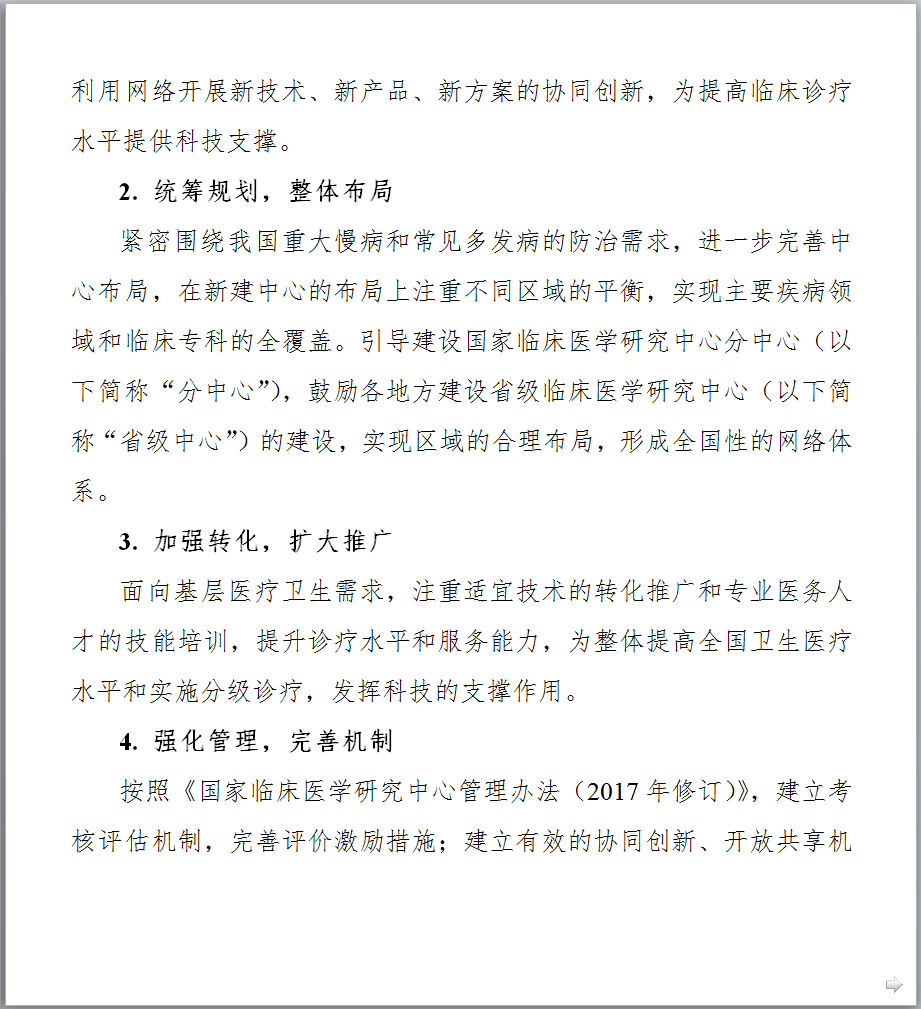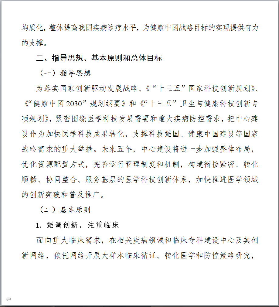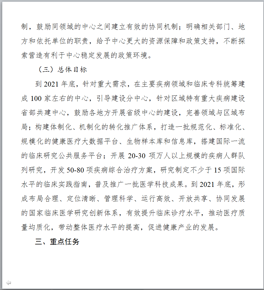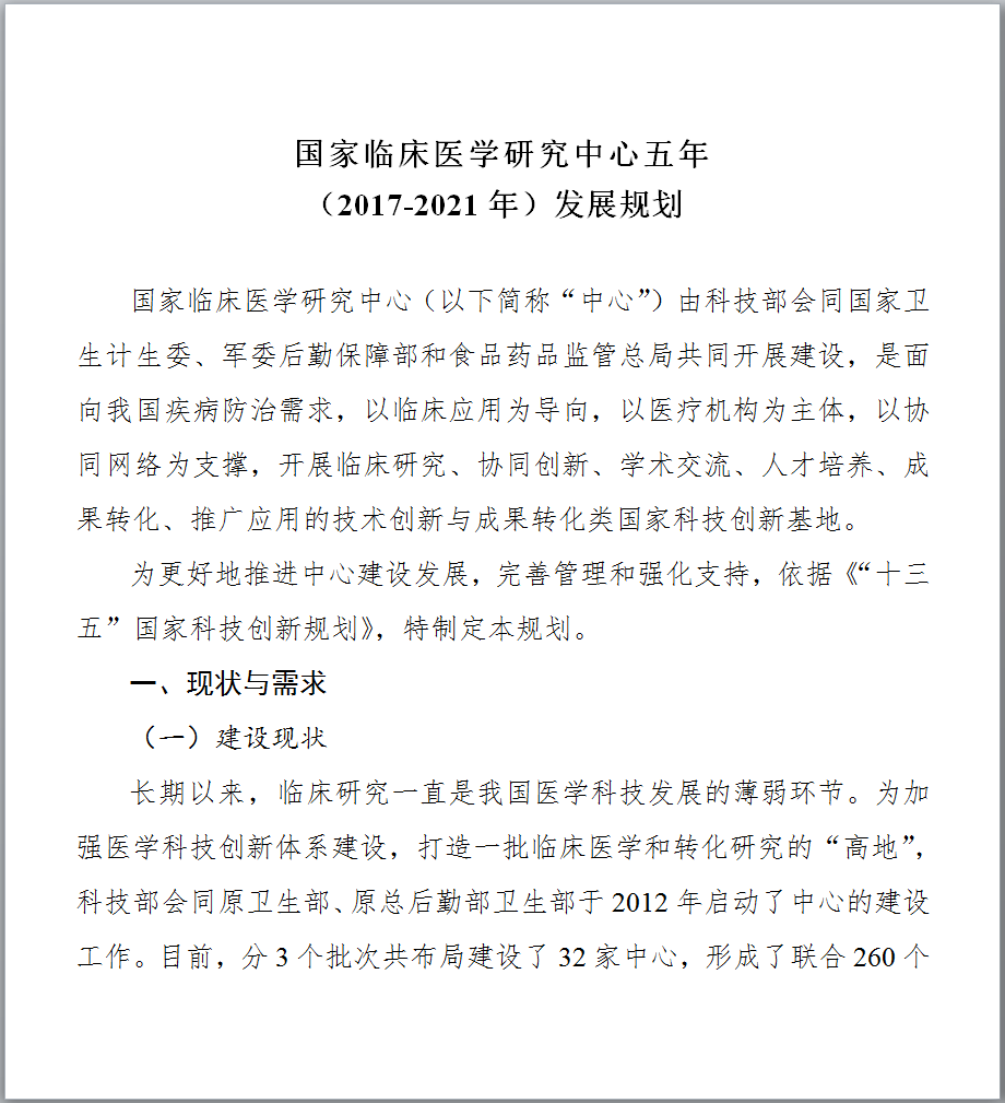 图片来源:科技部官网 最新发布的《文件一》提出,到2021年底,针对重大需求,在主要疾病领域和临床专科统筹建成100家左右的中心,引导建设分中心,针对区域特有重大疾病建设省部共建中心,鼓励各地方开展省级中心的建设,完善领域与区域布局;形成布局合理、定位清晰、管理科学、运行高效、开放共享、协同发展的国家临床医学研究创新体系,有效提升临床诊疗水平,推动医疗质量均质化,带动整体医疗水平的提高,促进健康产业的发展。 以下是《国家临床医学研究中心五年(2017-2021年)发展规划》全文,点击【科技部官网】查看所有文件详情。