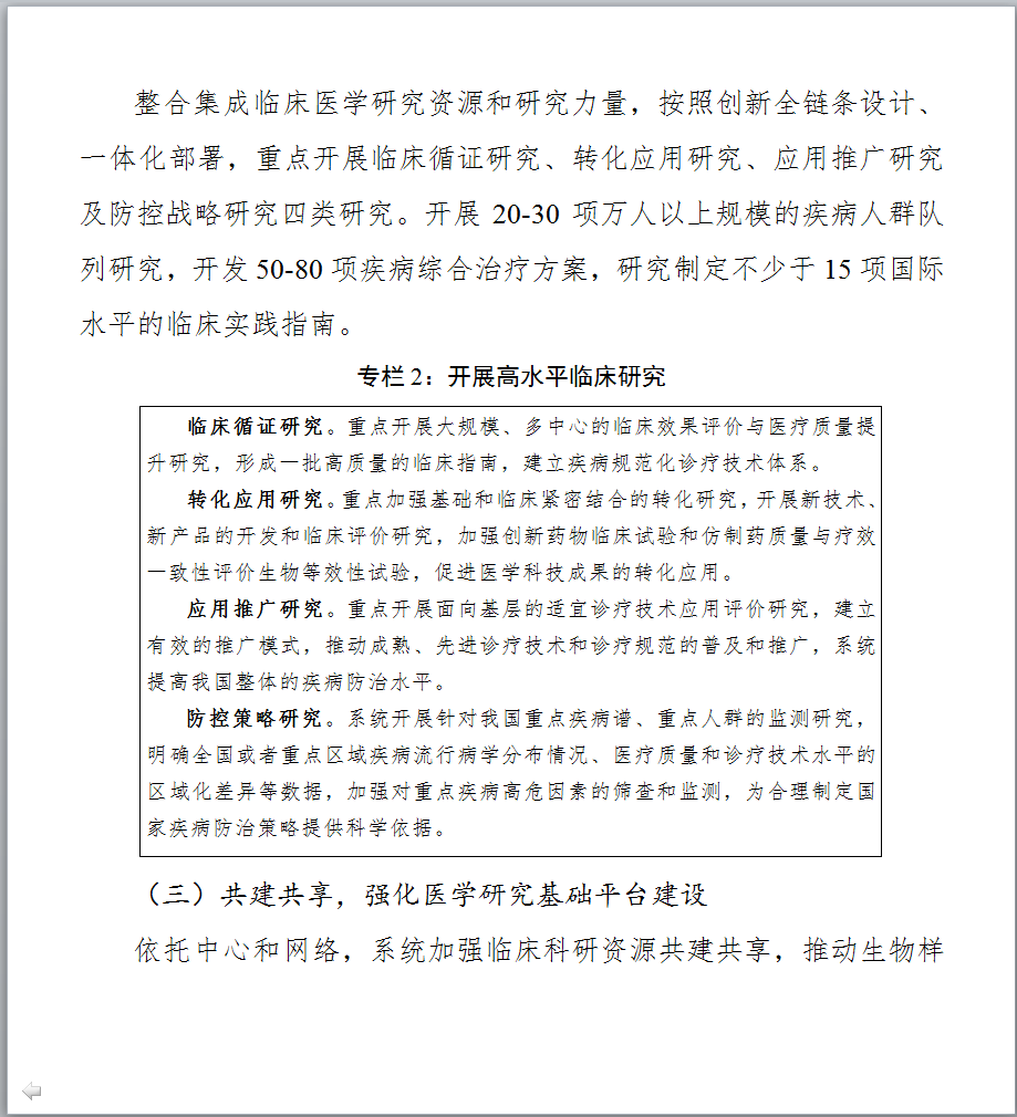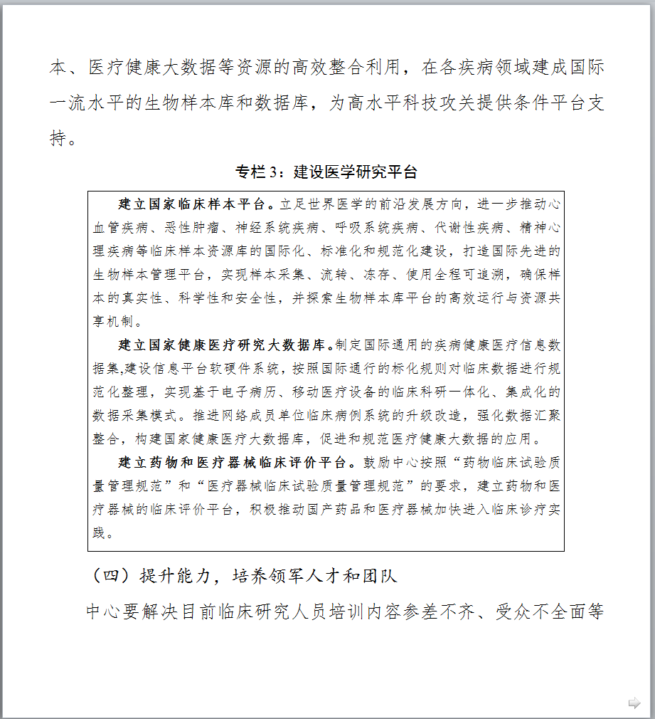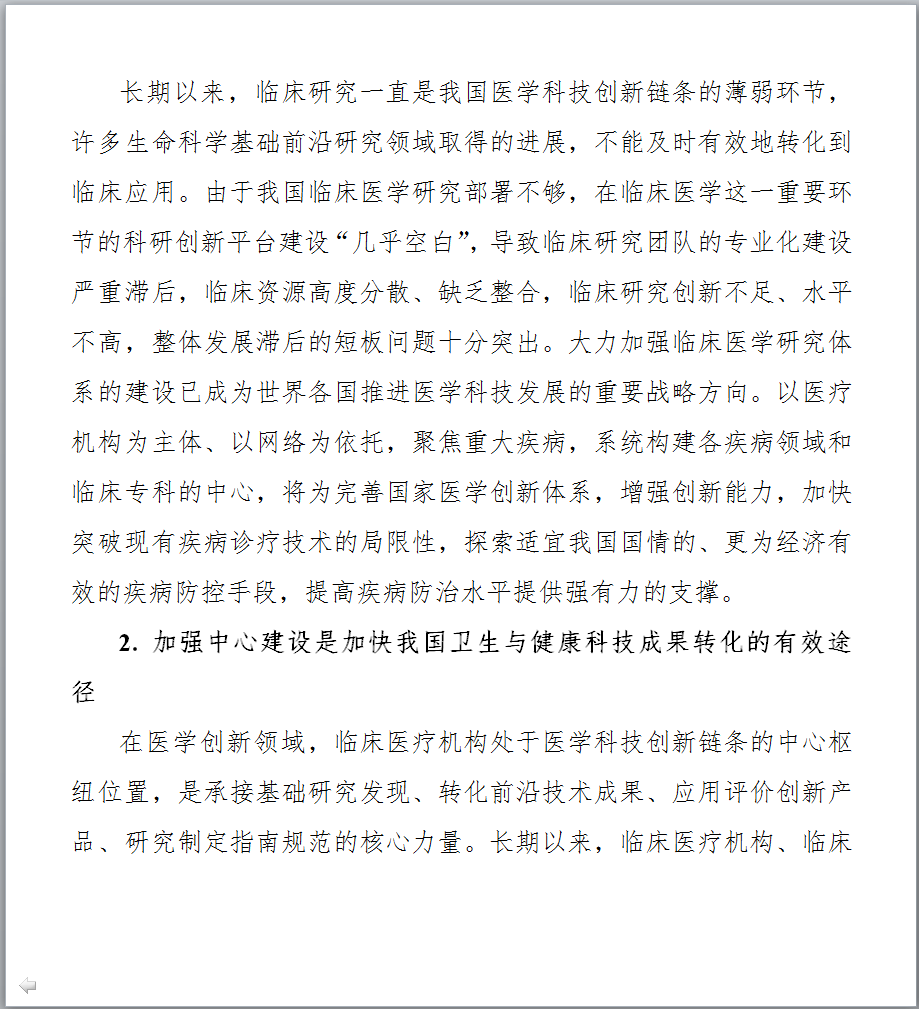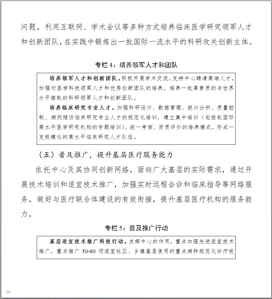 图片来源:科技部官网 最新发布的《文件一》提出,到2021年底,针对重大需求,在主要疾病领域和临床专科统筹建成100家左右的中心,引导建设分中心,针对区域特有重大疾病建设省部共建中心,鼓励各地方开展省级中心的建设,完善领域与区域布局;形成布局合理、定位清晰、管理科学、运行高效、开放共享、协同发展的国家临床医学研究创新体系,有效提升临床诊疗水平,推动医疗质量均质化,带动整体医疗水平的提高,促进健康产业的发展。 以下是《国家临床医学研究中心五年(2017-2021年)发展规划》全文,点击【科技部官网】查看所有文件详情。