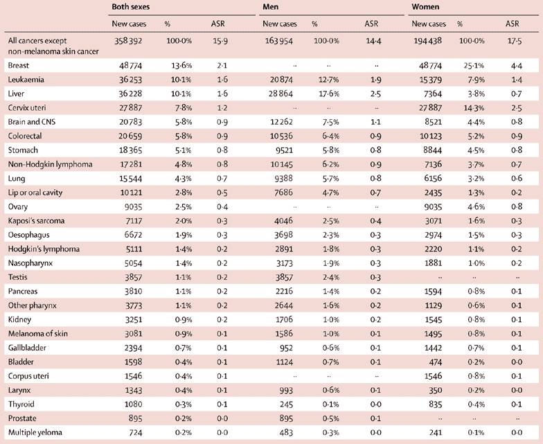 在一项基于人群的研究中,研究人员根据国际癌症研究机构GLOBOCAN 2012的相关数据对2012年全球20-39岁年轻人的癌症新发病数和死亡数进行了估计。