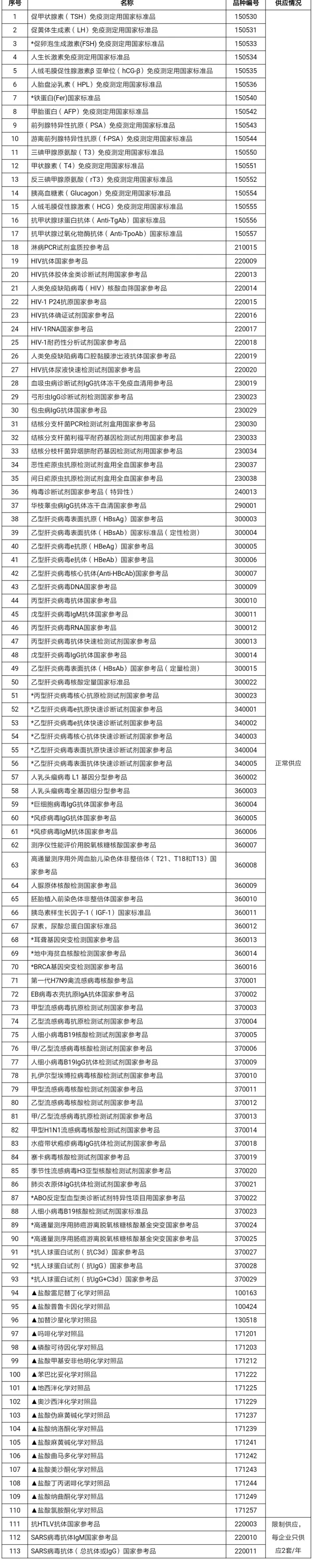 为配合《体外诊断试剂注册管理办法》(国家食品药品监督管理总局令第5号)的实施执行,经各方共同努力,在注册检验用体外诊断试剂国家标准品和参考品目录(第三期)的基础上,新增20个品种,同时将三期目录的4个限制供应的品种调整为正常供应品种,现将113个品种公布如下。
