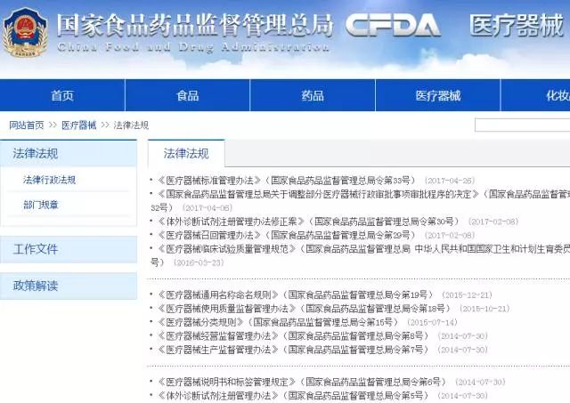 10月25日,CFDA在该栏目下上线22个医疗器械相关政策法规及其相关解读,其中涉及医械分类、医械研制、医械生产、医械经营、医械注册、医械使用、医械召回、医械监管、大型医用设备配置、《刑法》对医疗器械的相关规定等等。