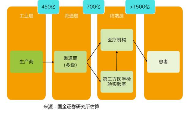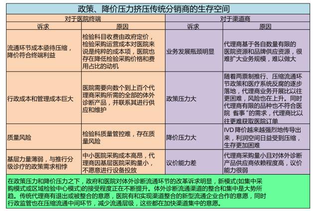 ▌ 来源:泰山汇健康金融 摘要:IVD流通行业目前正处于跑马圈地的快速扩张阶段,新模式将逐步整合和取代传统代理经销商的市场份额。我们认为当前IVD渠道整合的机遇大于高值耗材,更大于药品。我们看好拥有可复制性强,扩张能力好的商业模式的企业,尤其是龙头公司借助优势资源、丰富技术、经验积累,将是最可能的赢家。 一、IVD行业的整体市场规模估算 体外诊断产业链,主要由上游的工业商(体外诊断制造企业),中游的流通商(体外诊断产品经销商)和终端(各类医疗机构、血站、疾控中心、第三方医学实验室等)构成。IVD行业产业链的市场规模情况,如下图所示: 二、政策与降低压力促进渠道整合 自2015年以来,随着“两票制”、“集中采购”等政策的出台,对产业链各个环节产生了巨大的影响,IVD行业出现了巨大的降价压力,以上市公司为代表的大型诊断流通企业对中小代理商的收购不断加速,未来行业集中度有望持续提高。政策、降价压力的具体影响如下图所示: 三、IVD行业产业链分析: 1.上游工业:国外品牌占强势地位。进口品牌在中国占据优势,统治了高端体外诊断技术领域(如分子诊断、化学发光等)。国产体外诊断产品目前主要定位于低端技术和低端市场,但由于厂家众多且规模小(目前国内体外诊断试剂产品注册总数超过17000个,生产企业和经销企业均超万家,但2015年销售收入超过10亿的生产企业仅有迈瑞、科华、迈克等少数几家),同质化严重(大部分企业集中于生化和免疫领域),竞争十分激烈。 2.中游流通:代理经销为主流模式。行业内多采用“仪器+试剂”捆绑代理销售模式,大型企业有较强的议价能力。目前,各个省的招标政策不尽一致,但总体是上对国产倾斜,行业格局有望重新洗牌。不同于药品,IVD流通中的分销商既是代理商,又是配送商。因此,目前体外诊断流通领域并没有不可取代的大型企业。 3.下游市场:三级医院为主要市场。在国内市场,各级公立医院尤其是三级医院是体外诊断产品消费的主要终端。IVD采购没有大范围统一的招标采购流程,与药品相比,目前体外诊断仪器和试剂采购和招标情况相对复杂,既有直接采购,又有省级、市级和医院等多种招标,但总的来说,医疗机构在体外诊断产品采购中拥有的决策权力显著大于药品。