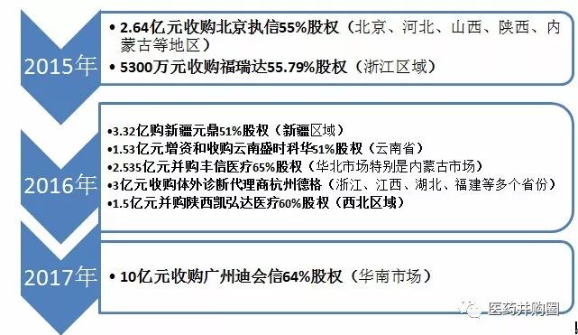 2016年 1、3.32亿购新疆元鼎51%股权(代理商渠道整合) 并购情况:公司拟使用自筹资金3.32亿元受让德清元康投资咨询合伙企业(有限合伙)、德清文鼎投资咨询合伙企业(有限合伙)合计持有的新疆元鼎医疗器械有限公司的共计51%的股权即478.125万元出资额。 标的介绍: 新疆元鼎已建立起包括齐全的产品组合、专业技术服务团队与服务网络、全流程信息化管理、仓储冷链物流配送系统的医学实验室综合服务体系,在新疆区域,拥有突出的竞争优势,树立了优质的品牌形象和市场美誉。新疆元鼎2014年、2015年1-11月实现净利润4555.65万元、5609.17万元。 业绩承诺: 新疆元鼎2015年净利润不低于5600万元、2016年净利润不低于8000万元、2017年净利润不低于1亿元,否则将按约定对公司进行补偿。 并购意义:本次投资是公司渠道整合战略又一重要实施举措,加速推进了“服务+产品”双轮驱动服务模式的升级。