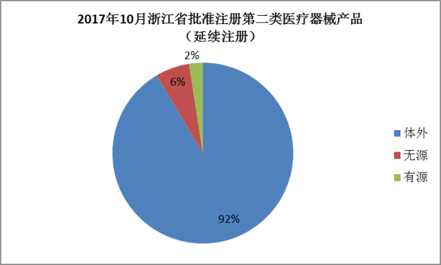 2017年10月,浙江省食品药品监督管理局共批准注册第二类医疗器械产品110个,其中首次注册28个,包括有源类6个,无源类11个,体外诊断试剂11个;延续注册82个,包括有源类2个,无源类5个,体外诊断试剂75个。