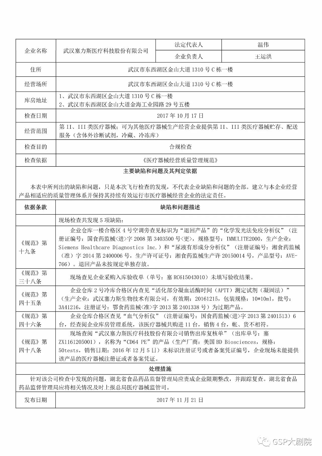 以上内容来自塞力斯官网 以上内容来自食药监总局 该通报显示,2017年10月17日,武汉塞力斯医疗科技股份有限公司接受了药监总局的《医疗器械经营质量管理规范》合规检查,并且在现场检查中被发现存在5项缺陷。