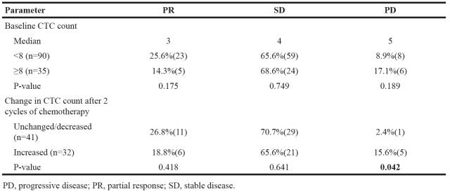 表2 预测PFS和OS的单因素或多因素COX回归分析 4 CTC与化疗疗效 在73例连续监测的患者中,17例患者治疗后PR,50例治疗后SD,6例进展。CTC数目持续升高与不良的化疗疗效密切相关(表3)。治疗后CTC升高组的疾病进展率明显高于CTC未升高组(15.6% vs.2.4%,p=0.042)。 表3 CTC变化与化疗疗效 结论: Cyttel CTC在肺癌中检出率与之前报道一致(84.25%),远远高于cellsearch检测系统。且基线CTC和化疗过程中的CTC变化在晚期非小细胞肺癌患者监测治疗疗效和评估预后中具有良好的临床应用价值,或可用于更好地指导制定治疗方案。