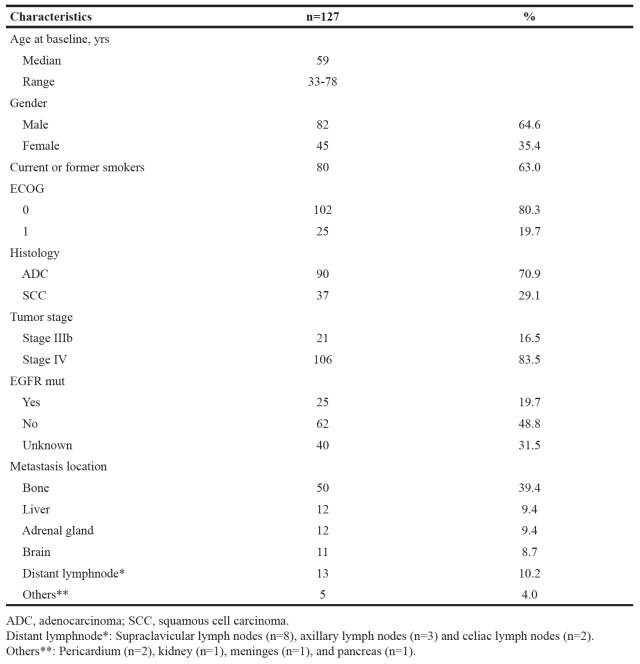 1 患者特征 从2012年9月到2015年9月,通过入排标准筛选共纳入127例符合要求的患者。在这些患者中,有73例完成了一周期,二周期和三周期化疗前的CTC检测。表一统计了127例患者的临床特征。在89例肺腺癌患者中,72例患者检测了组织中的EGFR突变和ALK重排情况,分别有25例患者(L858点突变和19号外显子缺失)和3例患者存在EGFR的突变和ALK的重排。然而,在组织分子检测结果得到之前,所有患者均已接受了一线化疗治疗。在127例患者中,50例接受培美曲塞+顺铂治疗,30例接受多西他赛+顺铂治疗,29例接受吉西他滨+顺铂治疗,18例接受紫杉醇+卡铂治疗。另外,有9例患者在疾病进展后接受了靶向治疗。 表1 患者的临床特征 2 基线和治疗过程中CTC检测情况