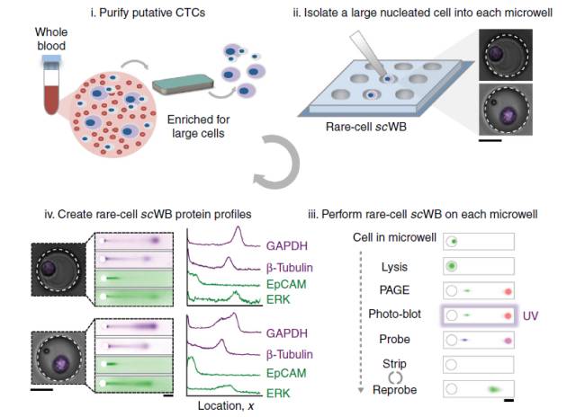 单细胞检测技术可以对信号通路蛋白(细胞膜受体,胞浆蛋白,转录因子)进行细致研究,从而对阐明生命的基本规律,研究疾病发生、发展的机理,对疫苗、靶向药物的开发都具有极其重要的意义。因此,基于单细胞的蛋白质研究能在更深的层次上揭示生命活动的本质和规律,从而为探究疾病的起因、发展和治疗提供更为可靠的科学依据。然而,测定单细胞中的蛋白质是一个极大的挑战,因为单细胞中蛋白质含量非常低,平均每个细胞中约含8 ×109 个蛋白质分子,却只含有1万多种蛋白质,某些种类的蛋白质分子甚至小于100个[3]。因此,灵敏的检测技术和先进的分离方法是分析单细胞蛋白质所必需的[4]。近年来,涌现了一系列单细胞蛋白定量检测的方法,包括微流控技术,微孔技术,基于活性的荧光探针技术和质谱技术等。其中微流控技术由于其检测通量高、快速准确、效益高、样本和试剂用量少等特点被广泛采用[5]。 在液体活检领域中,循环肿瘤细胞(Circulating Tumor Cell, CTC)在肿瘤诊断、治疗和监控等方面的临床表现已逐渐崭露头角,是目前最具发展潜力的肿瘤无创诊断和实时疗效监测手段。继而,CTC单细胞异质性的研究受到广泛的关注。由于外周血中的CTC含量极为稀少,在1mL外周血中含有约1 千万个白细胞和50 亿个红细胞,而仅含有数个CTC[6]。先对血液中的CTC进行富集,再对富集的细胞悬液进行CTC单细胞蛋白质研究是目前采用的主要方式。然而,一直因为检测技术不能够很好的满足临床需要,而使CTC异质性的研究停滞不前,影响CTC在肿瘤诊断及治疗中的指导作用。 美国 ProteinSimple 公司2016年推出的单细胞蛋白质表达定量分析系统【rare-cell, single-cell resolution Western Blot ( scWB ) —— Milo】应运而生。Rare-cell scWB可以很好的解决上述的两大技术难题。Rare-cell scWB是第一款单细胞水平,蛋白质表达定量分析系统。由美国加州大学伯克利分校,生物工程系Amy E. Herr教授实验室研发。该系统在一次普通的抽血(2―4mL血液)中,可以捕获到血样中极为稀少的CTC,并对其蛋白质表达水平进行分析,以检测其中与癌症相关的蛋白质。ProteinSimple的市场总监Kelly Gardner对rare-cell scWB(Milo)描述:传统Western不能体现细胞异质性,而Milo可以。该原创性技术连续发表了包括《Nature method》[7], 《Nature Protocol》[8]和《PNAS》[9]在内的一系列顶级杂志。并且当选The Scientist Magazine 评选的“Top10 Innovations 2016 ”的TOP1。 图:Milo单细胞蛋白质表达定量分析系统 单细胞蛋白质表达定量分析系统(rare-cell scWB)用于检测CTC的具体工作流程为(详见图1):①使用Vortex HT chip[10]从2-4mL全血中富集细胞(CTC);②将收集到的细胞悬液(300uL)直接加入scWB 微流控装置上,对CTC细胞核进行Hoescht 33342染色,便可以通过显微镜观察到每一个CTC被单独收集到每一个直径为50um的微孔中;③原位裂解细胞,释放蛋白,进行蛋白质电泳,将不同分子量蛋白进行分离。蛋白分离后,进行原位蛋白捕获,将分离好蛋白原位捕获在独特的水性分离胶中使用Western Blot验证抗体及荧光标记二抗直接杂交;④扫描仪进行芯片扫描后,Scout软件对扫描结果进行深度定量分析。 表1:单细胞蛋白质表达定量分析系统(rare-cell scWB)工作流程[11] Dr. Herr及其研究团队在健康人血液中分别加入三种不同的乳腺癌亚型肿瘤细胞:TNBC(BT-20) ;ER+ (MCF7) ;HER2+ (SK-BR-3),用白细胞和空白作为对照组,分别用三台设备进行检验。排除不同设备间的差异后,实验结果显示,rare-cell scWB不仅可以捕获单独的CTC,而且可以捕获到和其他细胞结合了的CTC[11]。证实了rare-cell scWB分析系统的捕获能力毋庸置疑。并且,rare-cell scWB可用于检测大量含有CTC和CTC含量稀少的个体。Rare-cell scWB分析系统符合当前临床的检测需求。 Rare-cell scWB分析系统在微流控单细胞采集孔中,原位蛋白裂解后直接进行蛋白质电泳,避免了传统蛋白抽提方法引起的样本丢失,并通过原位蛋白质捕获,无需转膜,避免传统Western转膜造成的蛋白丢失。通过蛋白质电泳,可将不同分子量蛋白质分离,当有非特异性结合时,可以通过蛋白大小,分辨特异信号,准确的进行特异靶蛋白信号定量,避免传统技术导至的非特异性信号。在蛋白质杂交过程中,单次可以进行四个靶蛋白检测,通过洗脱再杂交,单个细胞可以进行多达12种靶蛋白检测(详见表2)。且蛋白分离后的芯片,可以保存长达9个月,从而最大程度的保护稀缺的样本,便于后续进行更多的研究。 表2:单细胞蛋白质表达定量分析系统(rare-cell scWB)检测的蛋白种类 在肿瘤研究的过程中发现,肿瘤在生长过程中,经过多次分裂增殖,其子细胞呈现出分子生物学或基因方面的改变,这种肿瘤异质性使肿瘤的生长速度、侵袭能力、对药物的敏感性、预后等各方面产生差异[12]。人类要攻克癌症,需要对其异质性进行深入研究[13]。然而,由于外周血中CTC 含量极为稀少,CTC单细胞体积微小,加之CTC含有的蛋白质种类繁多、相对分子质量大、组成复杂且含量极低,导至CTC单细胞蛋白定量检测存在极大的难度。单细胞蛋白质表达定量分析系统(rare-cell scWB)对CTC在单细胞水平上进行多重蛋白质分析,将在肿瘤诊断、治疗和监控等方面进一步取得进展。对于肿瘤生物标志物的发现,肿瘤药物研究等具有使用价值的应用具有重要意义。 今后,关于CTC单细胞蛋白质定量检测方法的研究将继续以高灵敏度、高特异性、多重检测为目标不断发