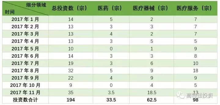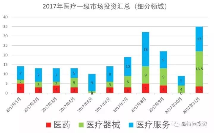 根据高特佳投资对医疗健康投资领域的细分方式(医药+医疗器械+医疗服务),2017年1至11月对见诸报道的各领域投资宗数统计如下: