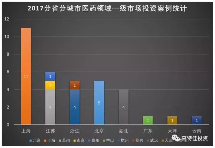 图4 :2017年分省分城市医药领域一级市场投资案例统计